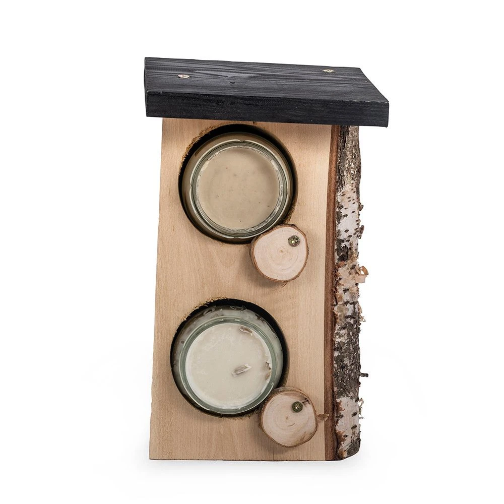 Dieser doppelte Erdnussbutter-Halter ist aus einem Birkenstamm gefertigt. An der Seite ist die Rinde noch sichtbar. Das Dach aus Kiefernholz ist mit einem schwarzen Lack auf Naturbasis behandelt Dadurch hat der Halter eine stimmige, natürliche Ausstrahlung In den Erdnussbutterglas-Halter passen zwei Gläser Gartenvögel-Erdnussbutter. Gesichert wird der Topf mit dem runden Holzriegel an der Vorderseite. Auf diese Weise fällt das Glas nicht heraus.