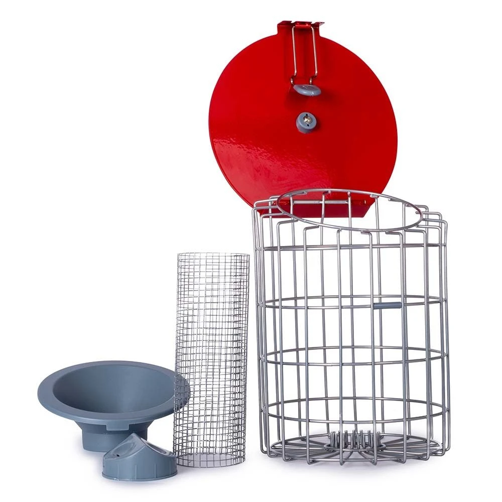 Die Erdnusssäule „Compact Roundhouse“ ist eine attraktive, moderne Erdnusssäule in Rot. Sie passt perfekt in jede Umgebung. Außerdem ist sie sehr gebrauchsfreundlich. Einfach den Deckel öffnen und befüllen. Die Maschen der Erdnusssäule sind so beschaffen, dass die Vögel nur kleine Erdnussstücke entnehmen können. Damit wird verhindert, dass vor allem Jungvögel an ganzen Erdnüssen ersticken. Außerdem bietet der Schutzkäfig nur kleinen Vögeln Platz und hält auch Fressfeinde auf Abstand. So können Ihre Gartenvögel ganz entspannt fressen.