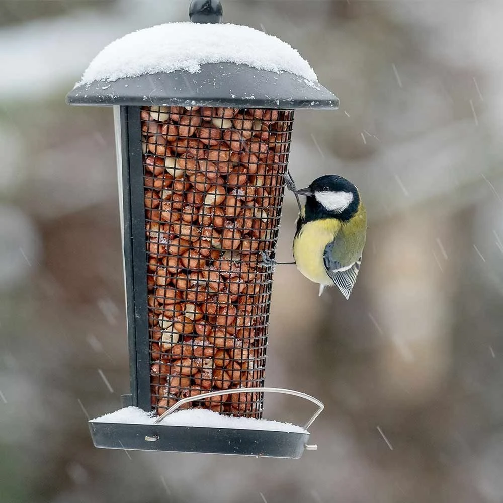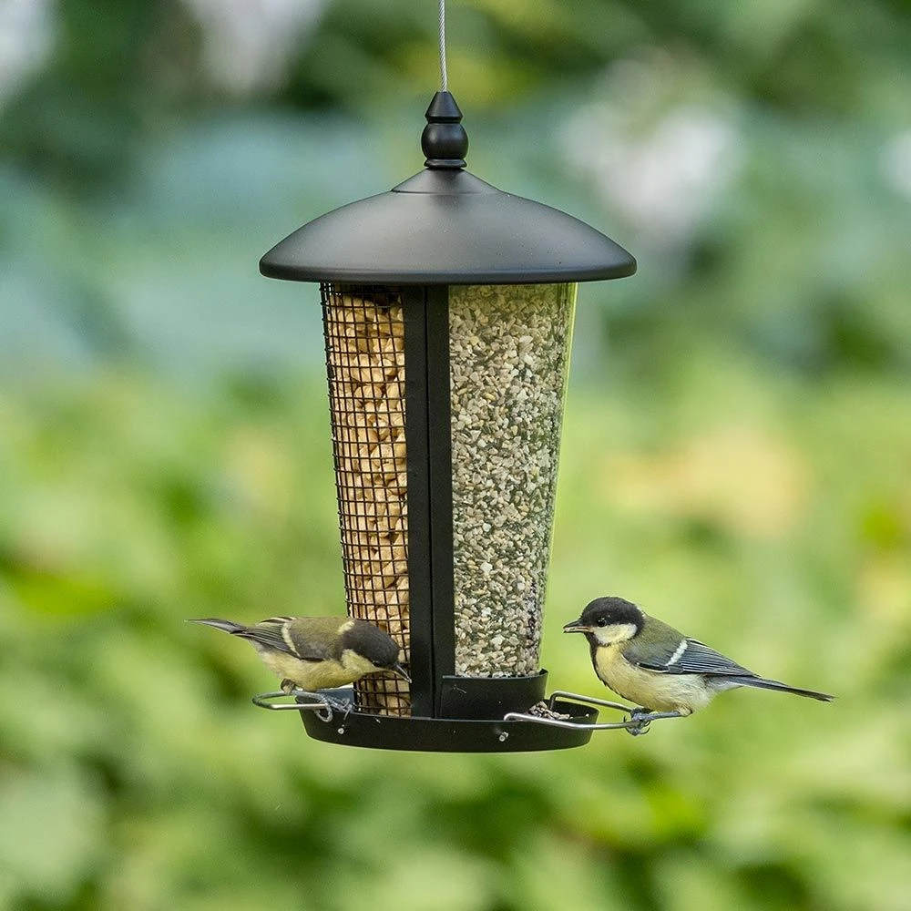 In der Futtersäule „Edessa“ können Sie Ihren Gartenvögeln Futtermischungen und Erdnüsse gleichzeitig anbieten – sie hat nämlich zwei Kammern. Die eine Kammer ist mit einer Polypropylen-Sichtscheibe versehen. Das Futter fällt durch eine Aussparung an der Unterseite in die kleine Schale. Durch das feinmaschige Drahtgeflecht an der anderen Seite können die Vögel problemlos Erdnussstückchen herauspicken. Es wird ihnen jedoch nicht gelingen, ganze Erdnüsse oder allzu große Stücke durch das Drahtgeflecht zu ziehen – Das ist sicherer für die Jungvögel, die daran ersticken könnten.
