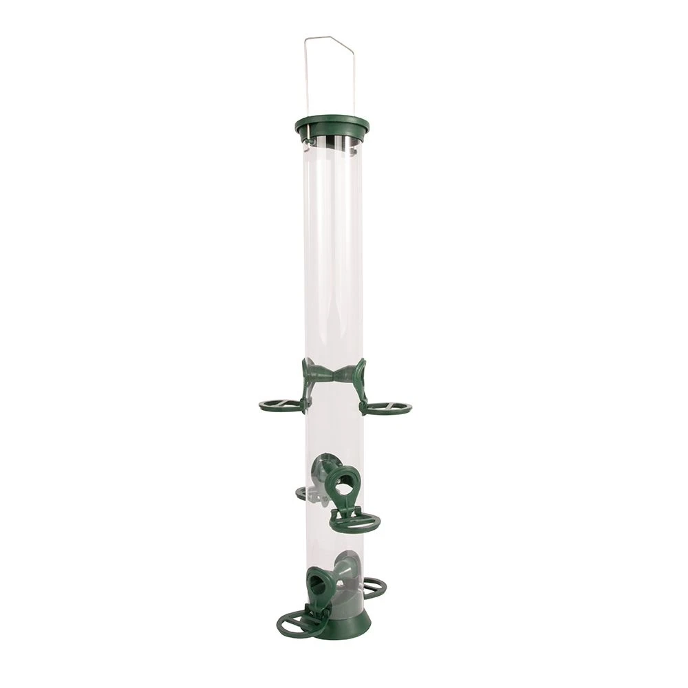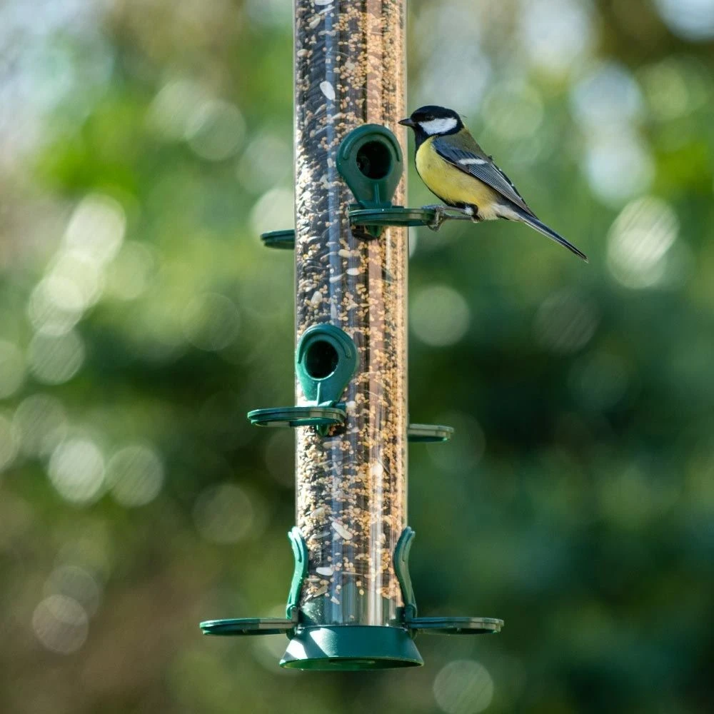 Futtersäulen sind äußerst stabil und haben eine lange Lebensdauer. Die durchsichtigen Futterröhren sind aus UV-beständigem Polycarbonat hergestellt und wurden auf Wetterfestigkeit geprüft, um sämtlichen Witterungsumständen dauerhaft standhalten zu können. Ein großer Vorteil dieser Futtersäulen liegt in der natürlichen Sitzhaltung der Vögel bei der Futteraufnahme: mit dem Kopf nach vorne. Die sechs Futteröffnungen dieser Säule sind nämlich mit einem Sitzring versehen. Ein einzigartiges und zugleich einfaches System, das außerordentlich zweckmäßig ist.