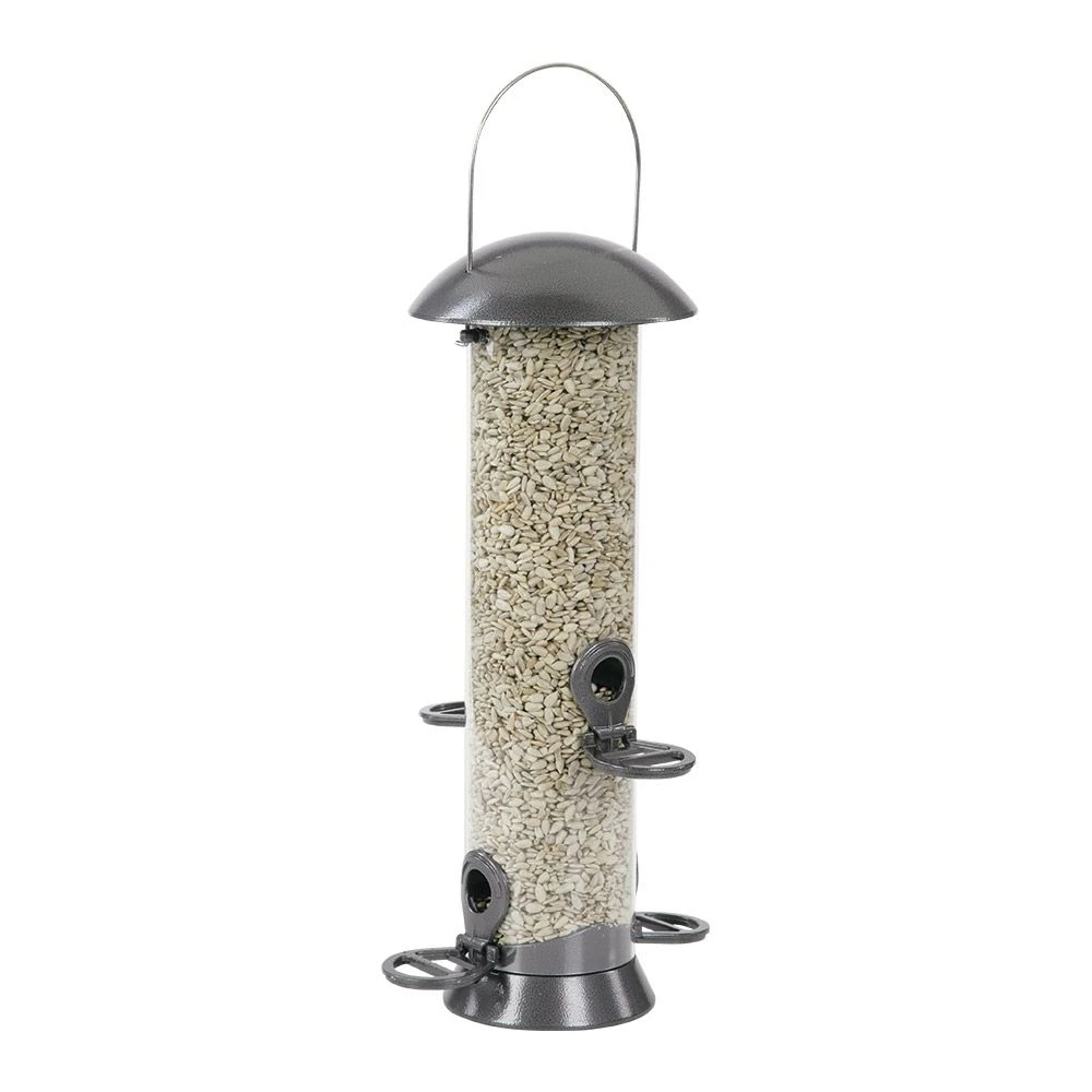 Der Durchmesser dieser Futtersäule ist extra breit (8,5 cm), wodurch sich auch die Füllmenge erhöht. Vor den vier Öffnungen befinden sich Sitzringe, von denen aus die Vögel in einer natürlichen Haltung fressen können. Deckel und Futteröffnungen sind aus Aluminium gefertigt und besitzen eine dunkelgraue Farbe. Bei dieser Futtersäulenausführung ist die Montage einer Auffangschale sowie eines Futtersäulenschutzes möglich.