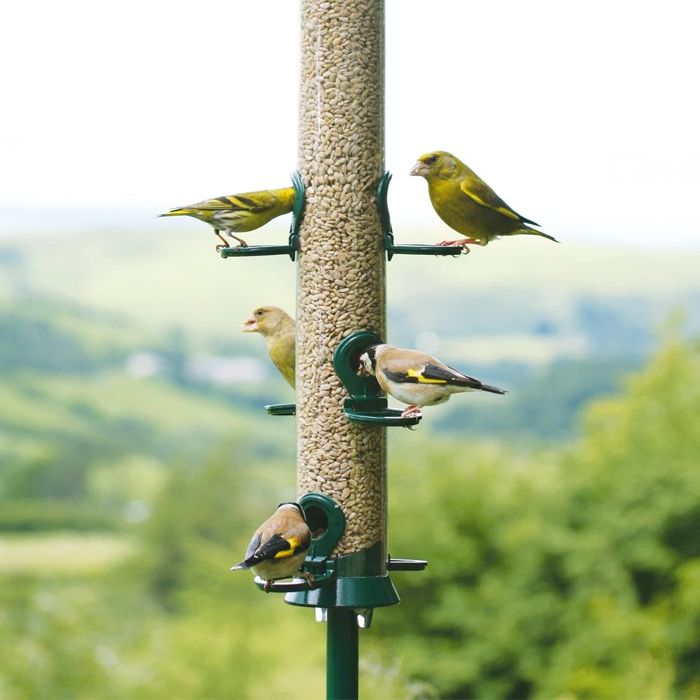 Futtersäulen sind äußerst stabil und haben eine lange Lebensdauer. Die durchsichtigen Futterröhren sind aus UV-beständigem Polycarbonat hergestellt und wurden auf Wetterfestigkeit geprüft, um sämtlichen Witterungsumständen standhalten zu können. Ein großer Vorteil dieser Futtersäulen liegt in der natürlichen Sitzhaltung der Vögel bei der Futteraufnahme: mit dem Kopf nach vorne. Die sechs Futteröffnungen dieser Säule sind nämlich mit einem Sitzring versehen. Ein einzigartiges und zugleich einfaches System, das außerordentlich zweckmäßig ist.