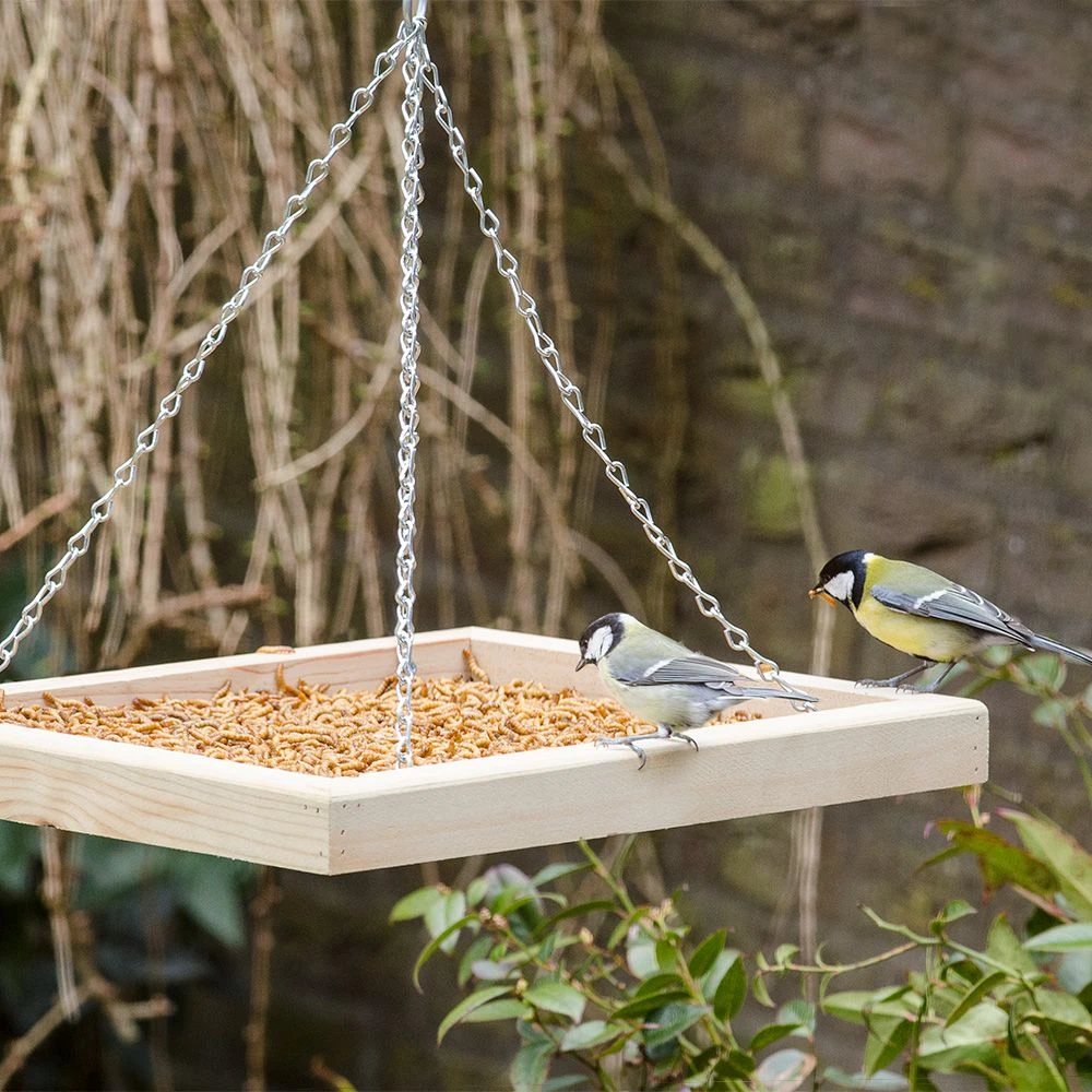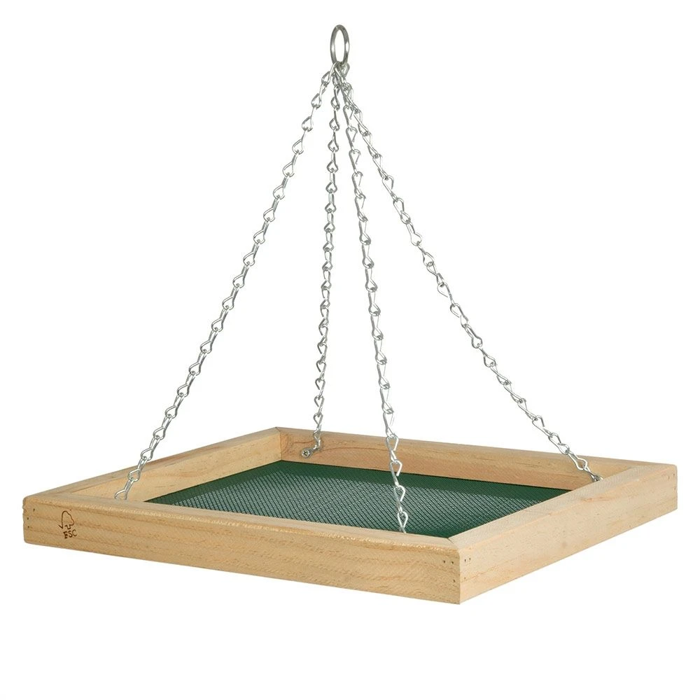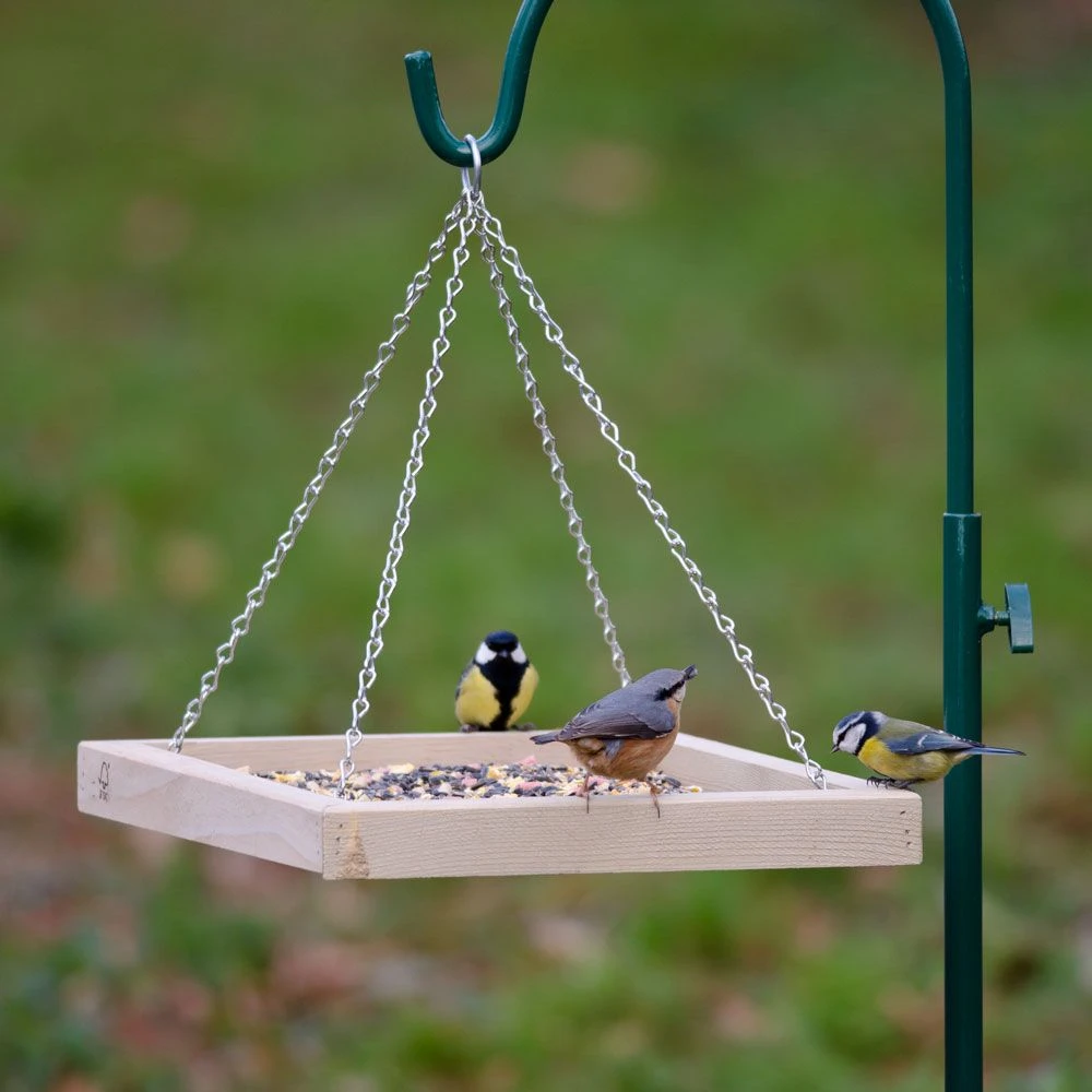 Ideal ist diese hängende Konstruktion für Gärten oder Balkone mit wenig Platz. Auch hier sorgt eine Drainage dafür, dass Regenwasser ablaufen kann, das Futter trocken bleibt und gegen Schimmel geschützt ist. Der Futtertisch ist mit einer stabilen Kette zum Aufhängen versehen.