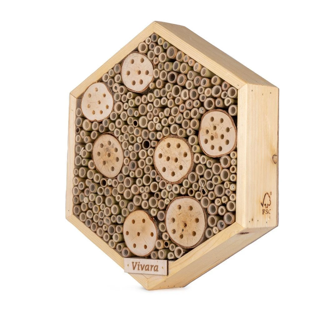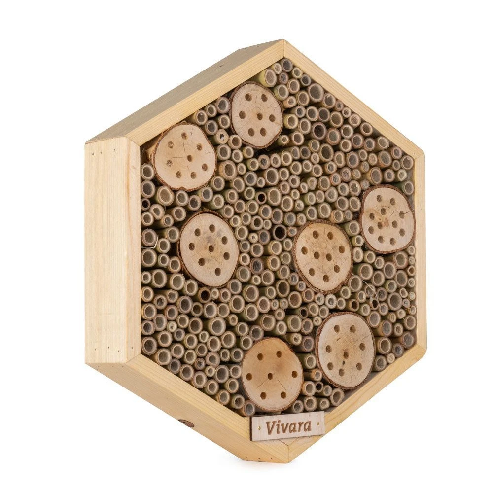Dieses attraktiv gestaltete Insektenhotel ist ein idealer Unterschlupf für Insekten. So nisten sich Solitärbienen gerne in einem Insektenhotel ein. Sie sammeln Pollen und tragen ihn in die Bambusröhren. Wenn sie genug gesammelt haben, legen sie ein Ei dazu und verschließen die Brutkammer mit einer weiteren Pollenschicht. Danach wiederholt sich der Vorgang und eine neue Brutkammer wird gebaut. Wenn die Brut schlüpft, dient der Pollen ihr als Nahrung und bahnt sich die junge Biene ihren Weg nach draußen, um auszufliegen.