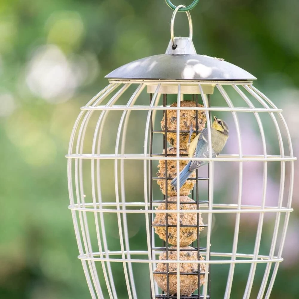 Der Meisenknödelhalter mit Schutzkäfig „Aura“ ist speziell dafür gemacht, kleinen Vögeln Meisenknödel anzubieten. Nur diese Vögel können durch die Gitterstäbe des Schutzkäfigs an das Futter gelangen und sicher und in aller Ruhe fressen.