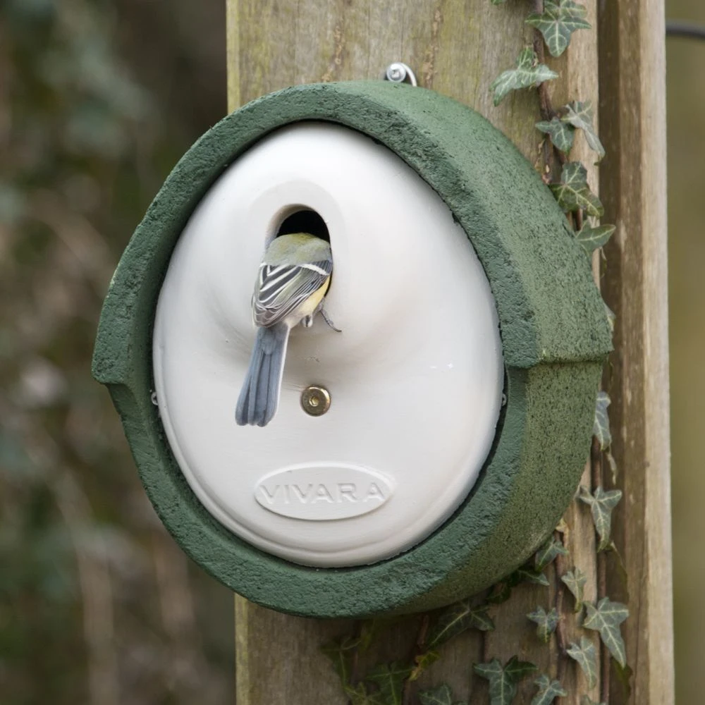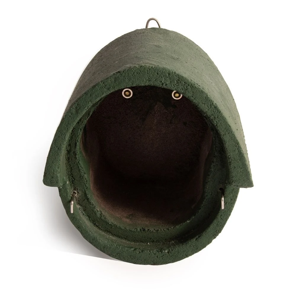 Die ovale Einflugöffnung eignet sich besonders für Meisen, Sperlinge, Kleiber sowie Trauerschnäpper und Rotschwanz. Der Kasten ist mit einem Marderschutz ausgestattet und besteht aus WoodStone bzw. Holzbeton, einer speziellen Mischung aus Beton und Holzfasern, welche besonders isoliert und atmungsaktiv ist. In den Wintermonaten schützt das Material gegen Kälte, im Sommer verhindert es Überhitzung. Die konstante Temperatur im Kasten erhöht zudem die Überlebenschancen der Jungvögel erheblich.