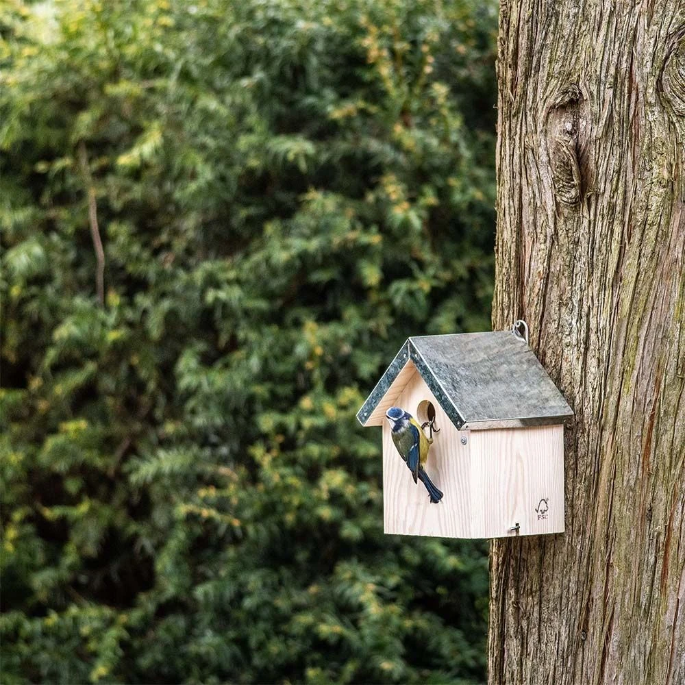 Mit seiner Einflugöffnung von 28 mm wurde der Nistkasten Helsinki speziell für kleinere Meisen wie u. a. die Blaumeise entwickelt. Nicht zuletzt dank seines attraktiven Designs ist dieses Modell ein Gewinn für jeden Garten. Die Metallplatte auf dem Dach verleiht dem hölzernen, weiß getünchten Nistkasten einen besonderen Pfiff. Das Holz unter der Metallplatte verhindert, dass die Temperatur im Nistkasten unnötig ansteigt.