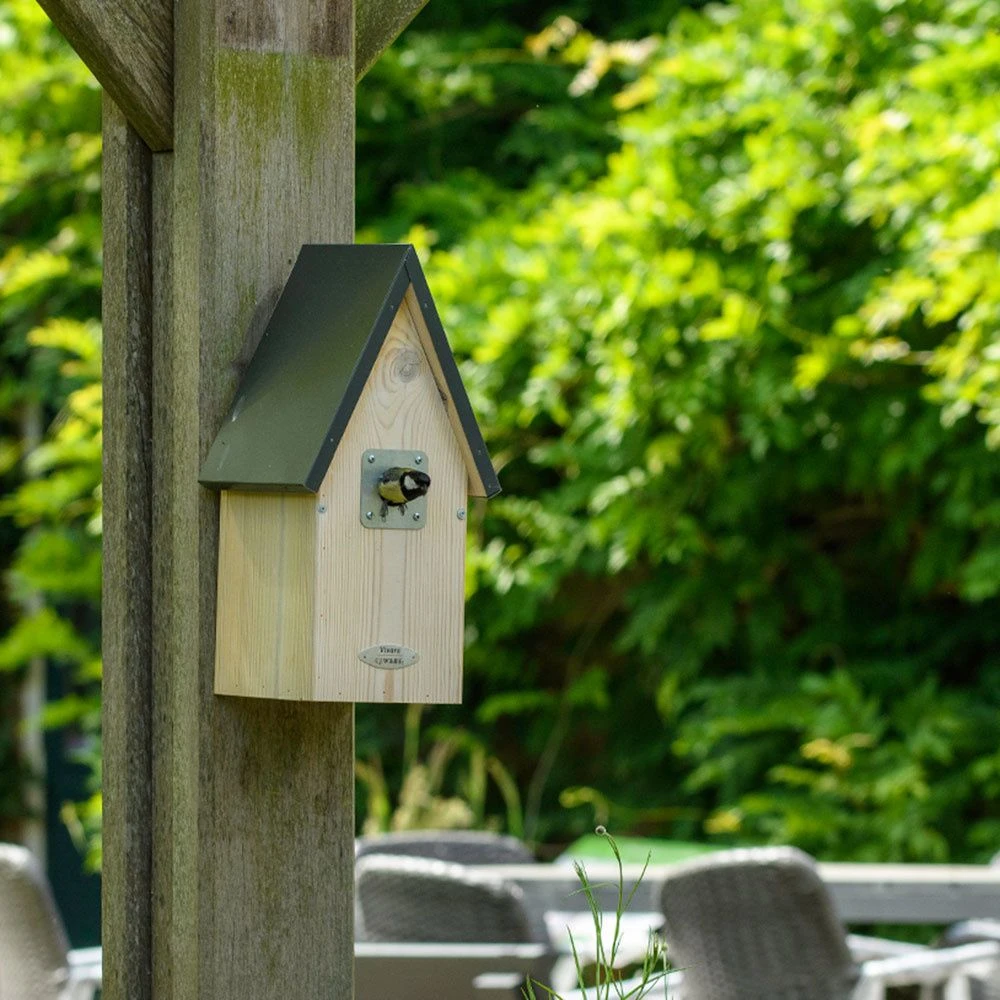 An der Seite kann der Nistkasten geöffnet werden, um ihn nach der Brutsaison zu reinigen. Tun Sie dies im Oktober. Dann können Sie sicher sein, dass kein Vogel mehr darin brütet. Außerdem stören Sie noch keine Vögel, die an kalten Wintertagen Unterschlupf im Nistkasten suchen.