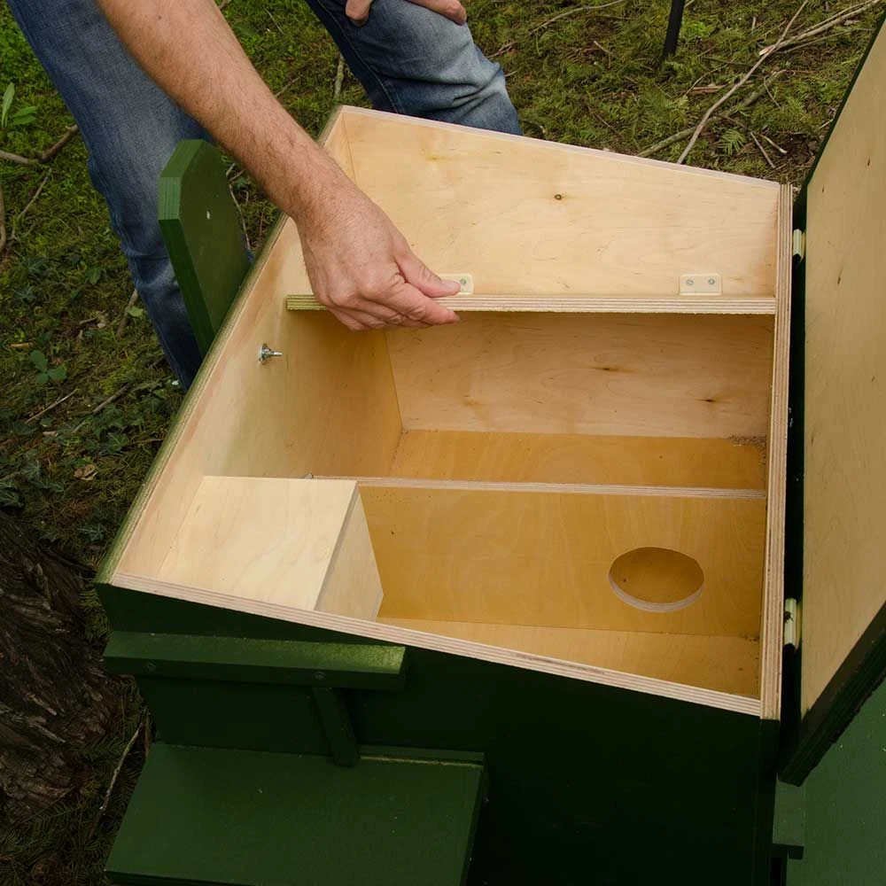 Gemeinsam mit Ornithologen und Naturschutzorganisationen hat Vivara diesen Kasten für Stein- und Baummarder entwickelt. Damit bieten Sie Mardern einen sicheren Unterschlupf, in dem sie auch ihr Nest bauen können. Sie werden sich dadurch weniger schnell ein Plätzchen in einem Schuppen oder unter einem Dach suchen, wo sie sich oft als eher lästige Bewohner erweisen. In diesem Kasten gibt es zudem einen „Säuglingsbereich“ – ideal für Marderweibchen und ihre Jungen.