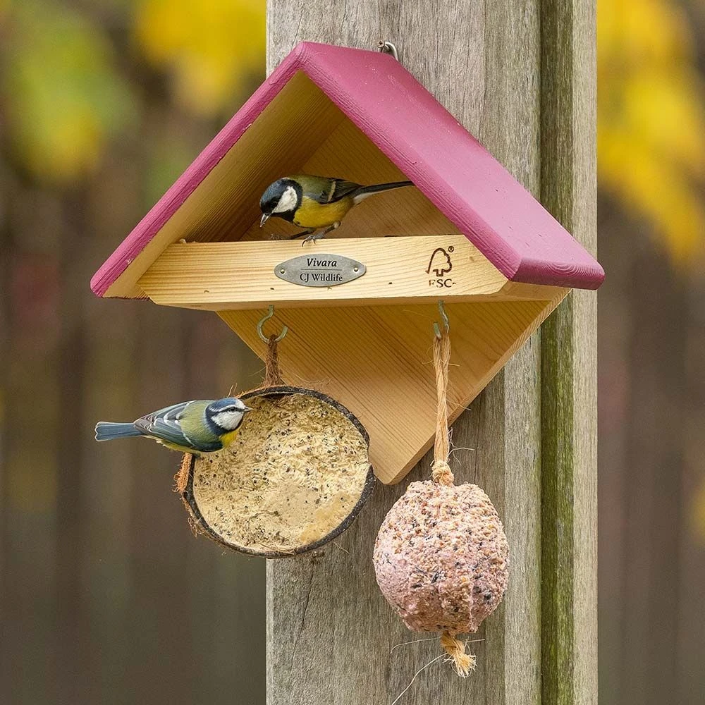 Das Wandfutterhaus „Yellowstone“ aus Holz ist Futtertisch und Aufhängesystem in einem. Der Futtertisch unter dem Dach eignet sich ideal für das Anbeiten energiereicher Saatmischungen, während an den beiden Haken an der Unterseite Futtersäulen, gefüllte Kokosnüsse, Energiekuchen oder anderes Vogelfutter aufgehängt werden kann.