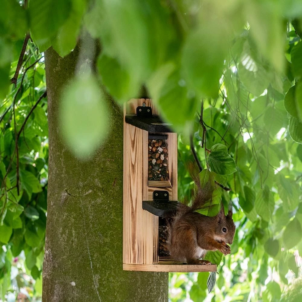 Der Eichhörnchen-Futterautomat „Gabriola“ hat doppelt so viel Fassungsvermögen wie andere Eichhörnchen-Futterautomaten in unserem Sortiment. Durch die obere Öffnung wird der Futterautomat befüllt; die Eichhörnchen fressen normalerweise aus der unteren Öffnung. Doch wer weiß, welche akrobatischen Kapriolen sie vollführen, um sich aus der oberen Öffnung zu bedienen? Befüllen Sie den Futterautomaten mit Pinienkernen, Nüssen oder der Eichhörnchen-Futtermischung von Vivara und freuen Sie sich über die Eichhörnchen, die sich das Futter schmecken lassen.